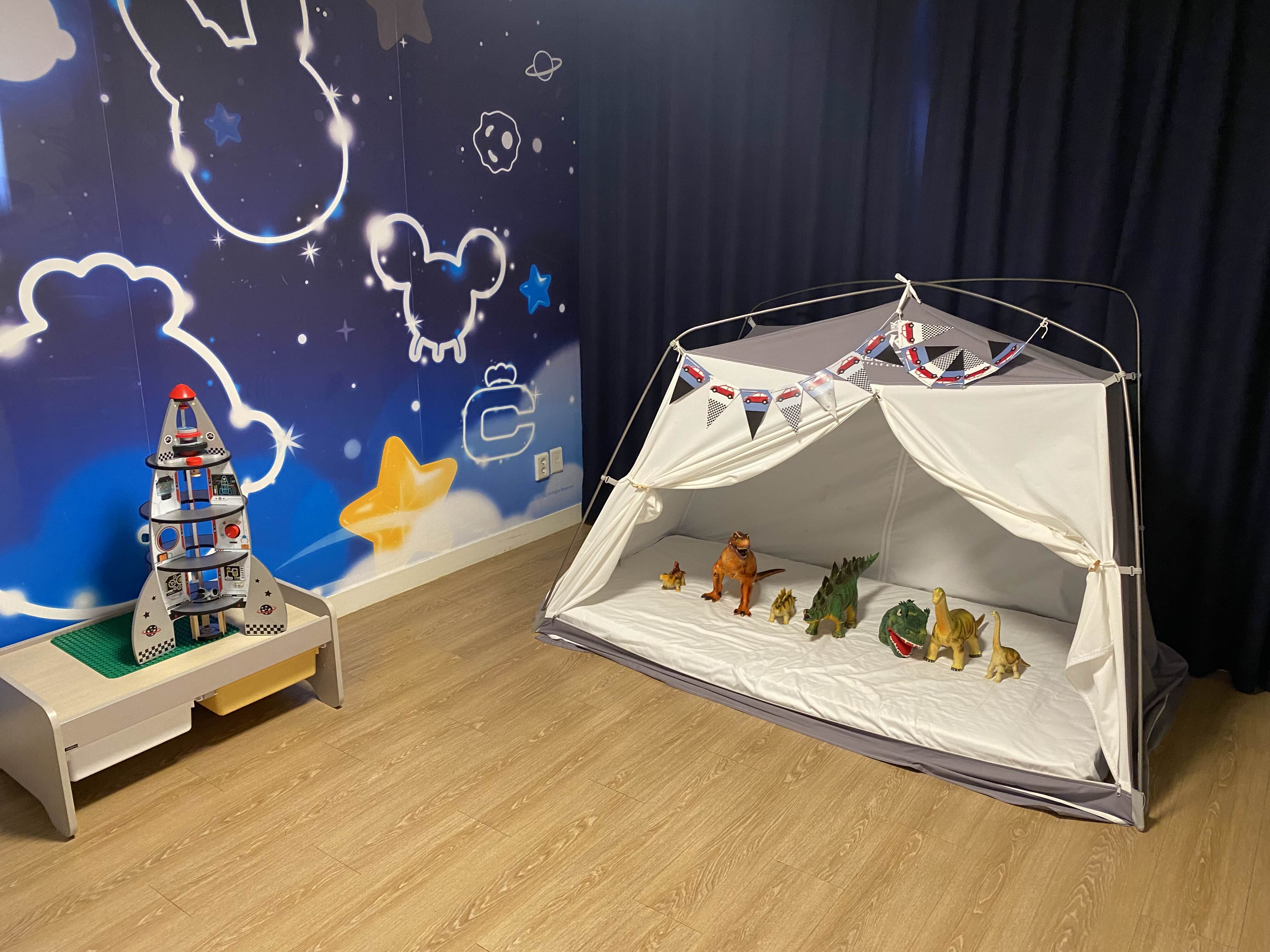 꼭 우주여행을 떠나는 아이들처럼 텐트 침대와 우주 장난감이 있었네요.