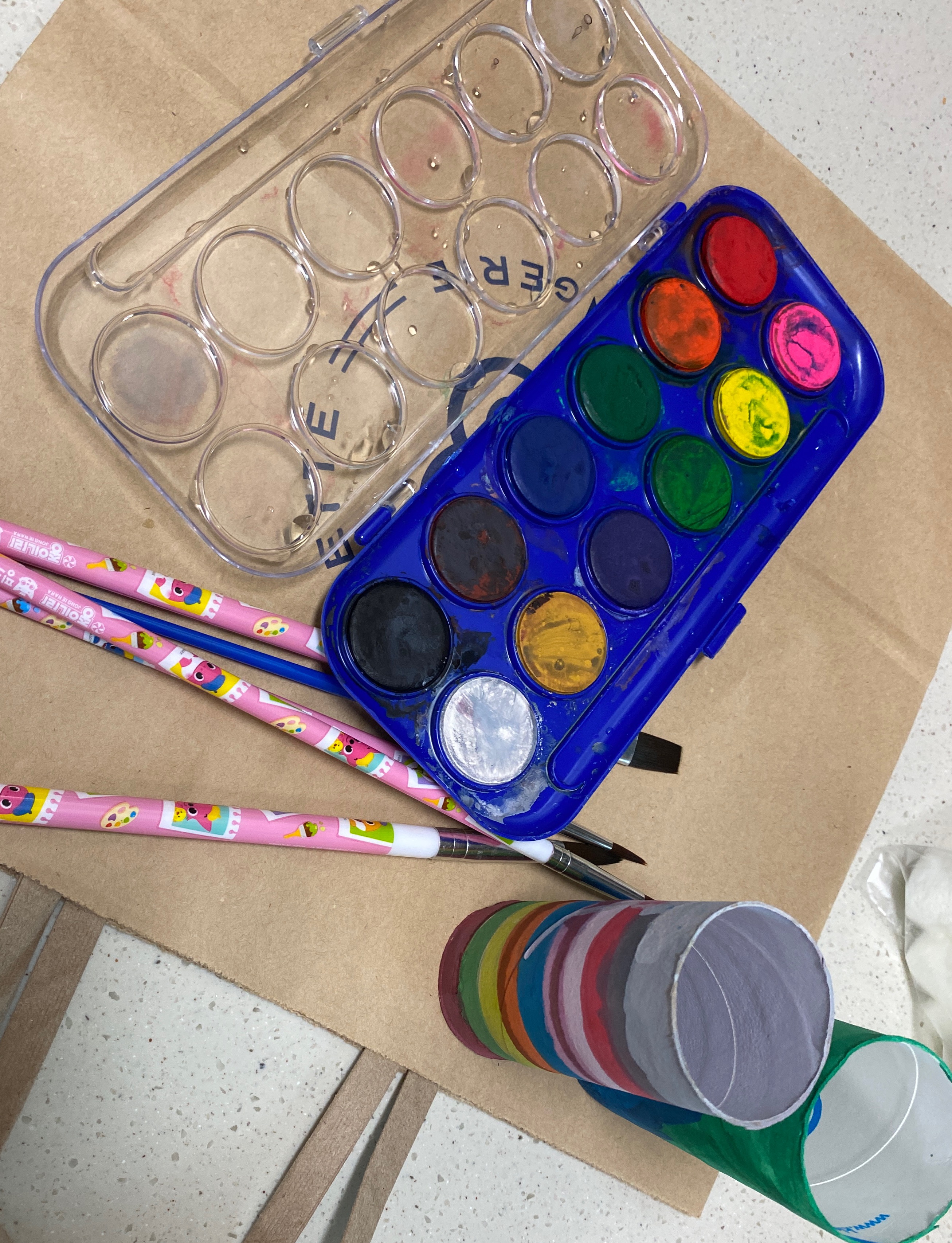 물감과 물그릇 작은 것 하나 준비했습니다.