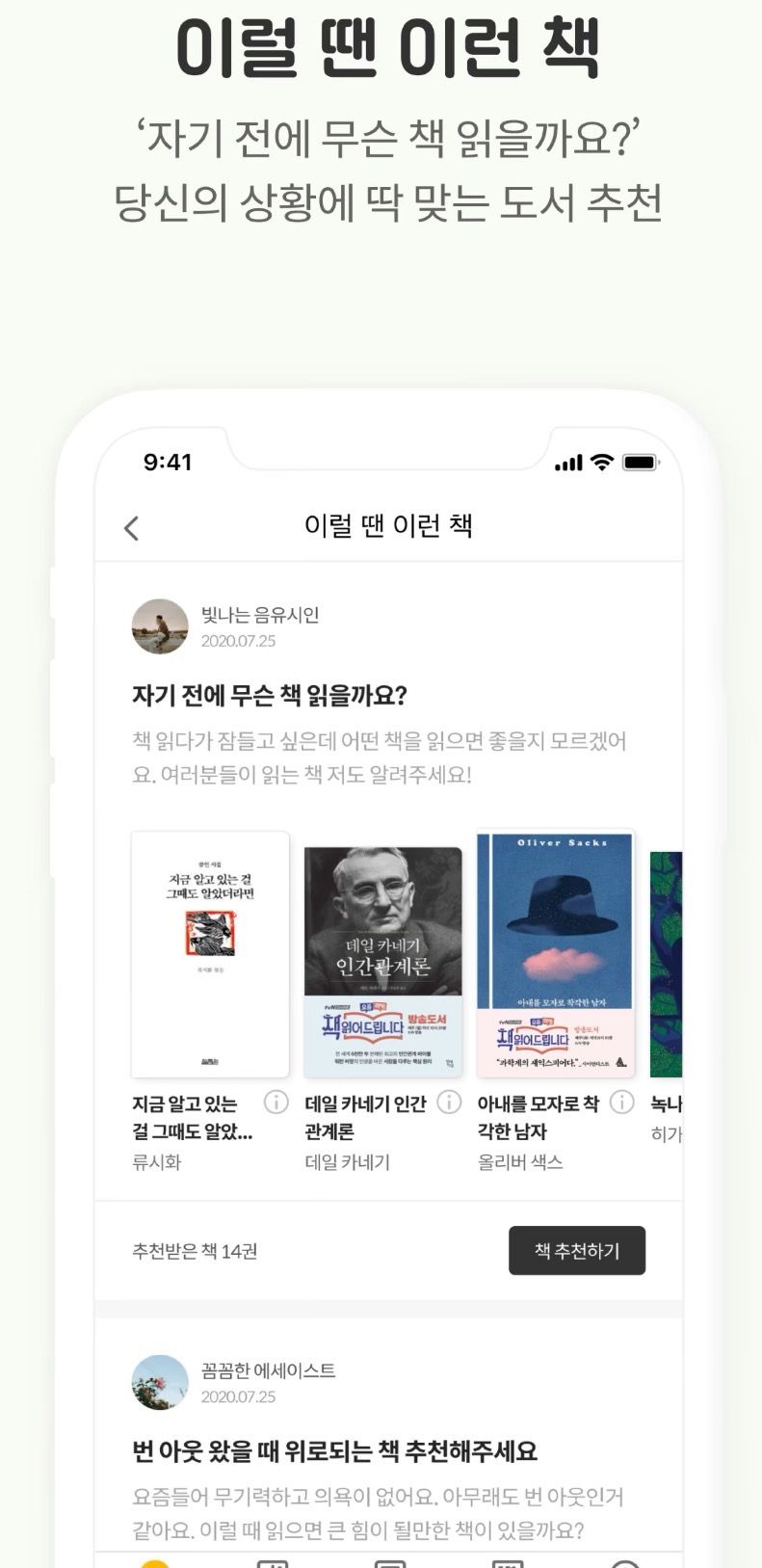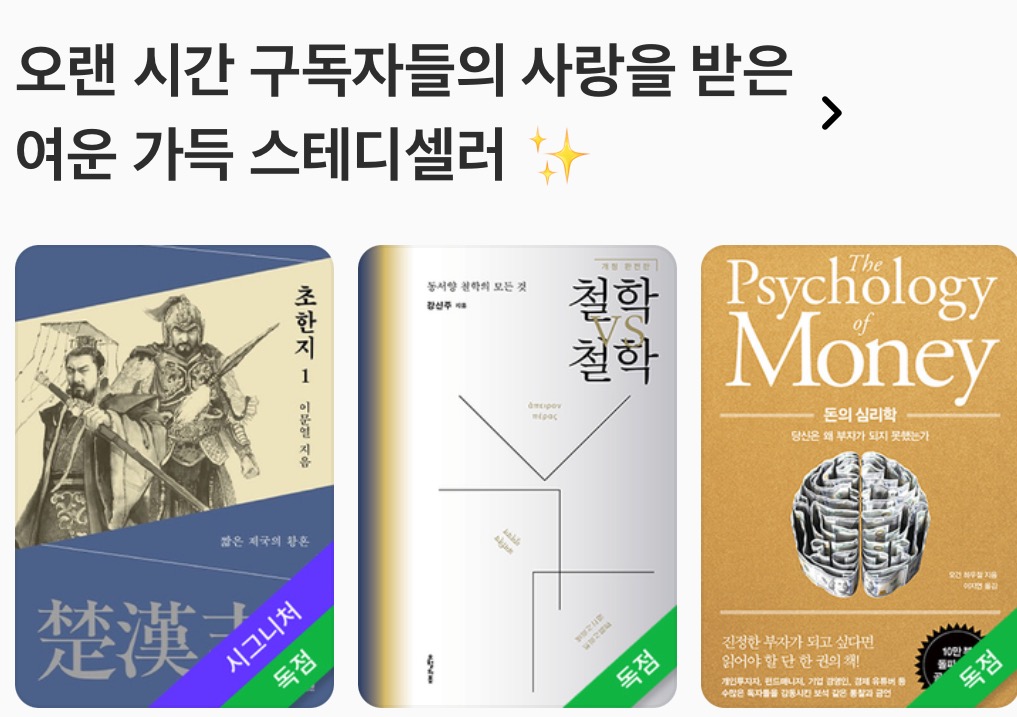 최신의 트렌드에 맞는 책을 선별하여 추천하는 기능도 있습니다. 오늘, 혹은 나의 기분이나 상황에 맞는 책 추천은 생각보다 좋았던 기능인 것 같습니다.
