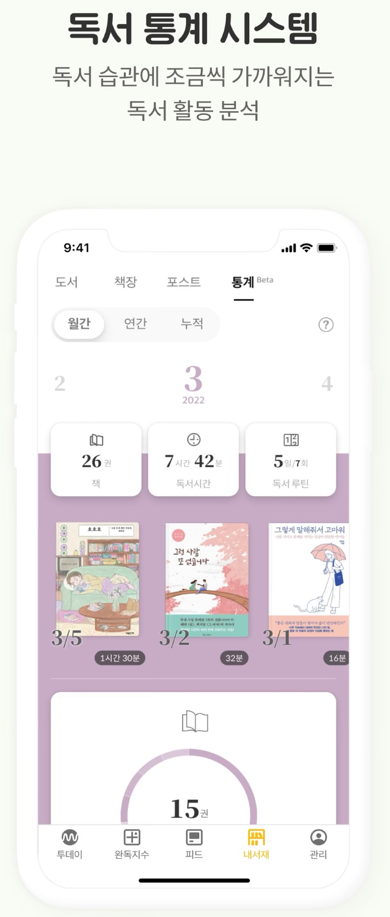 추가적인 기능으로는 내가 읽은 독서량과 독서시간을 년, 월, 일 기간에 따른 통계자료로 보여주기도 합니다.