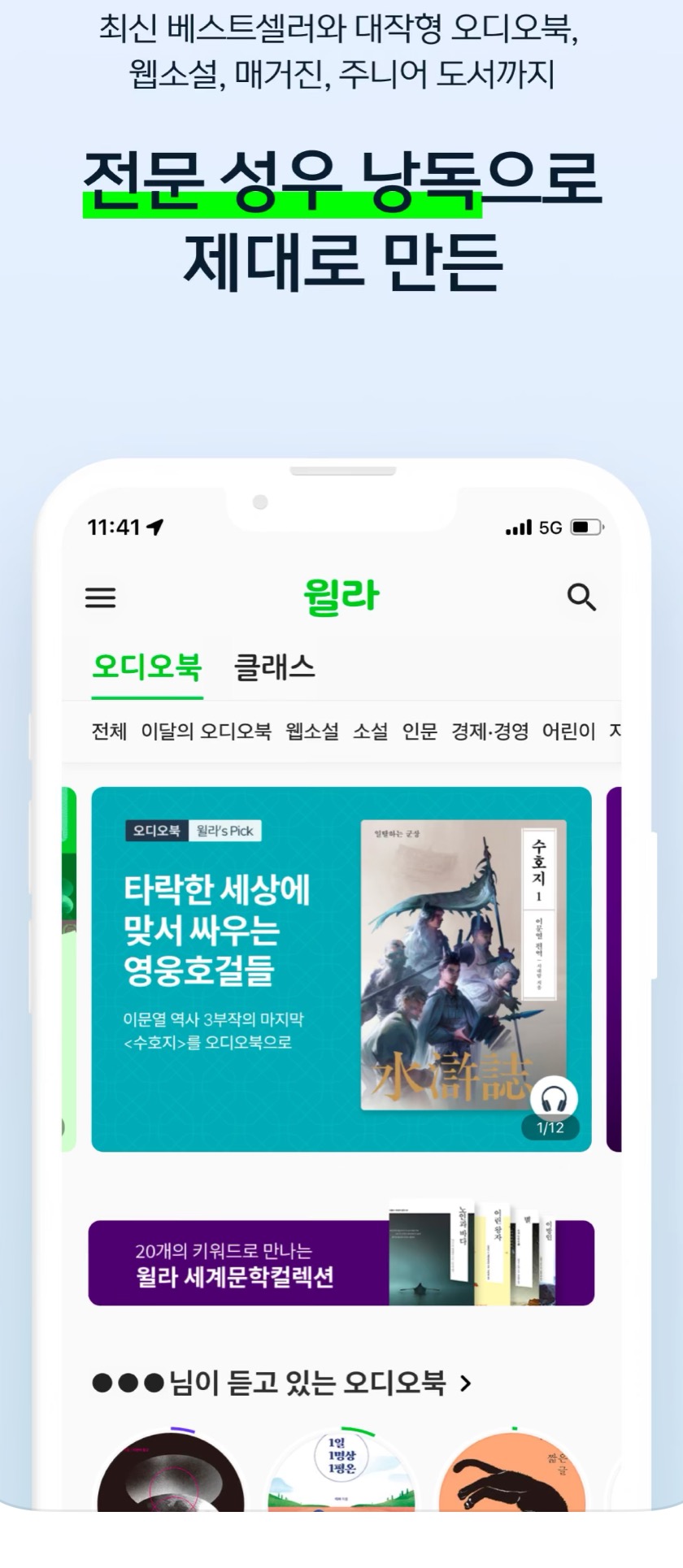 윌라에서 제공하는 음악, 성우, 캐릭터까지 표현한 고퀄리티 오디오 북 시리즈입니다.