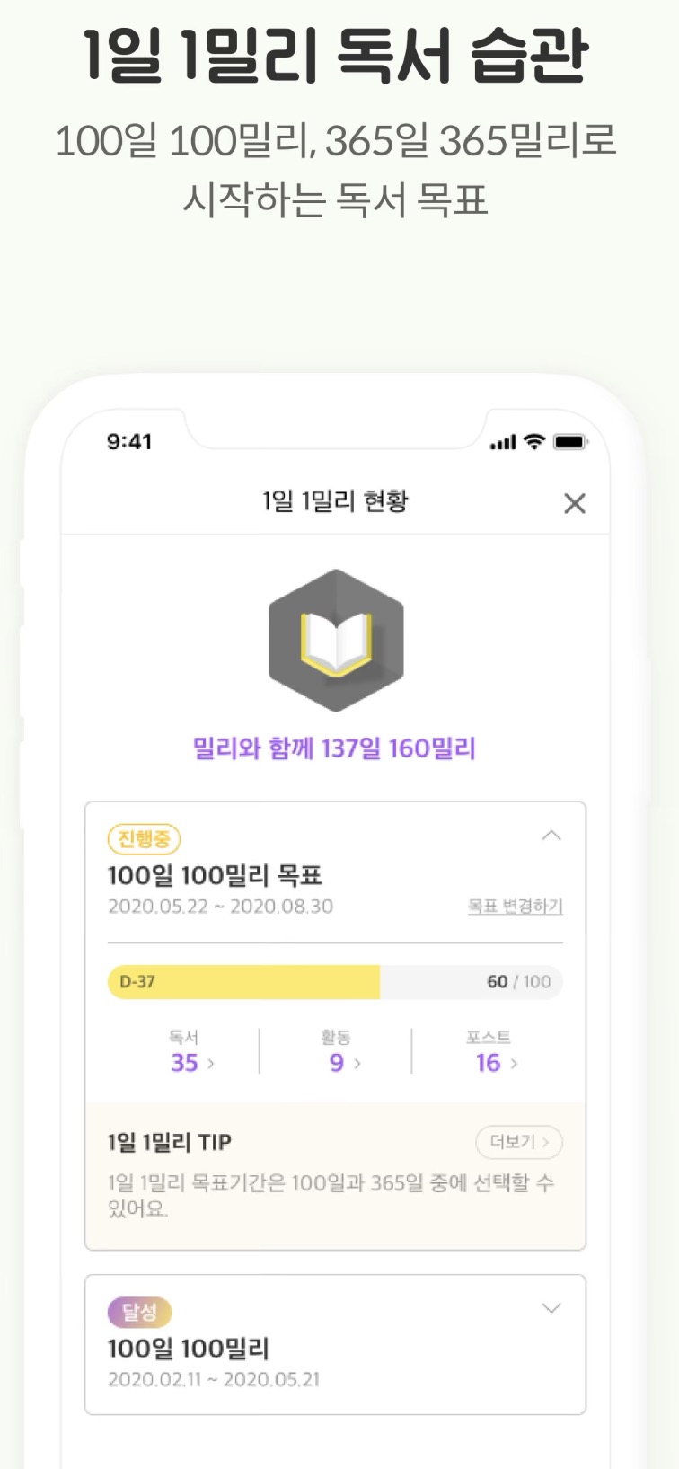 '밀리의 서재'를 이용하면서 생각보다 재미있었던 부분은 매일 책을 한 권 읽을따마다 1밀리씩 포인트가 적립되는데 이런 점이 별것 아닌 것 같았지만, 경쟁을 좋아하고 목표 달성을 중요하게 생각하는 한국 사람에게 딱 맞았던 기능이 아닌가 싶었습니다.
