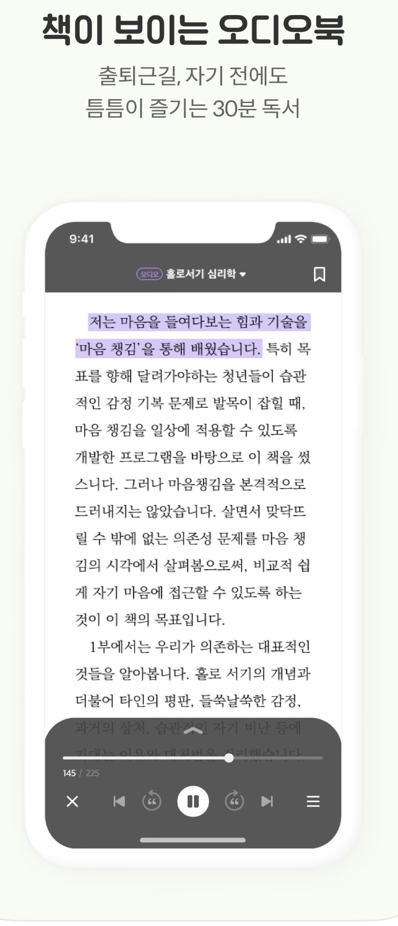 저처럼 지금까지 환경 탓만 하며 생각은 했지만 미뤄왔던 분들이 계시다면, 이 오디오북 기능을 잘 활용해서 독서라는 지혜의 양식을 하루 한 스푼만 드셔 보시길 바랍니다.