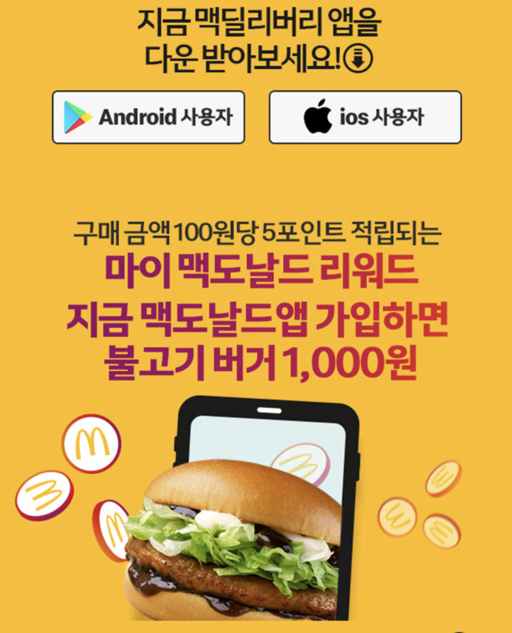 맥도날드 앱에 가입하게 되면 불고기 버거를 1000원에 구매할 수 있다고 하니 관심 있으신 분들은 한번 참여해 보시면 좋을 것 같습니다.