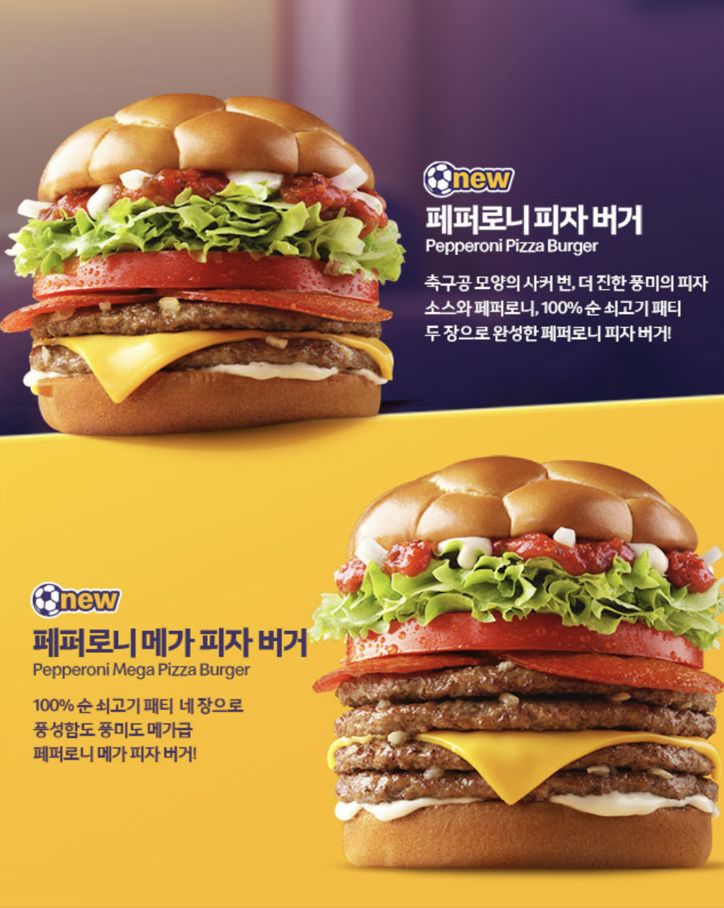 신메뉴의 빵은 축구공 모양의 '사커 번'이 사용되며, 페퍼로니와 피자소스로 맵고 짭짤한 풍미를 한껏 끌어올린 것이 특징입니다. 또한 순 쇠고기 패티와 치즈로 감칠맛이 더 배가 되었습니다. 토마토와 양상추, 양파등의 기본 야채는 비슷하게 들어가는 것 같습니다.