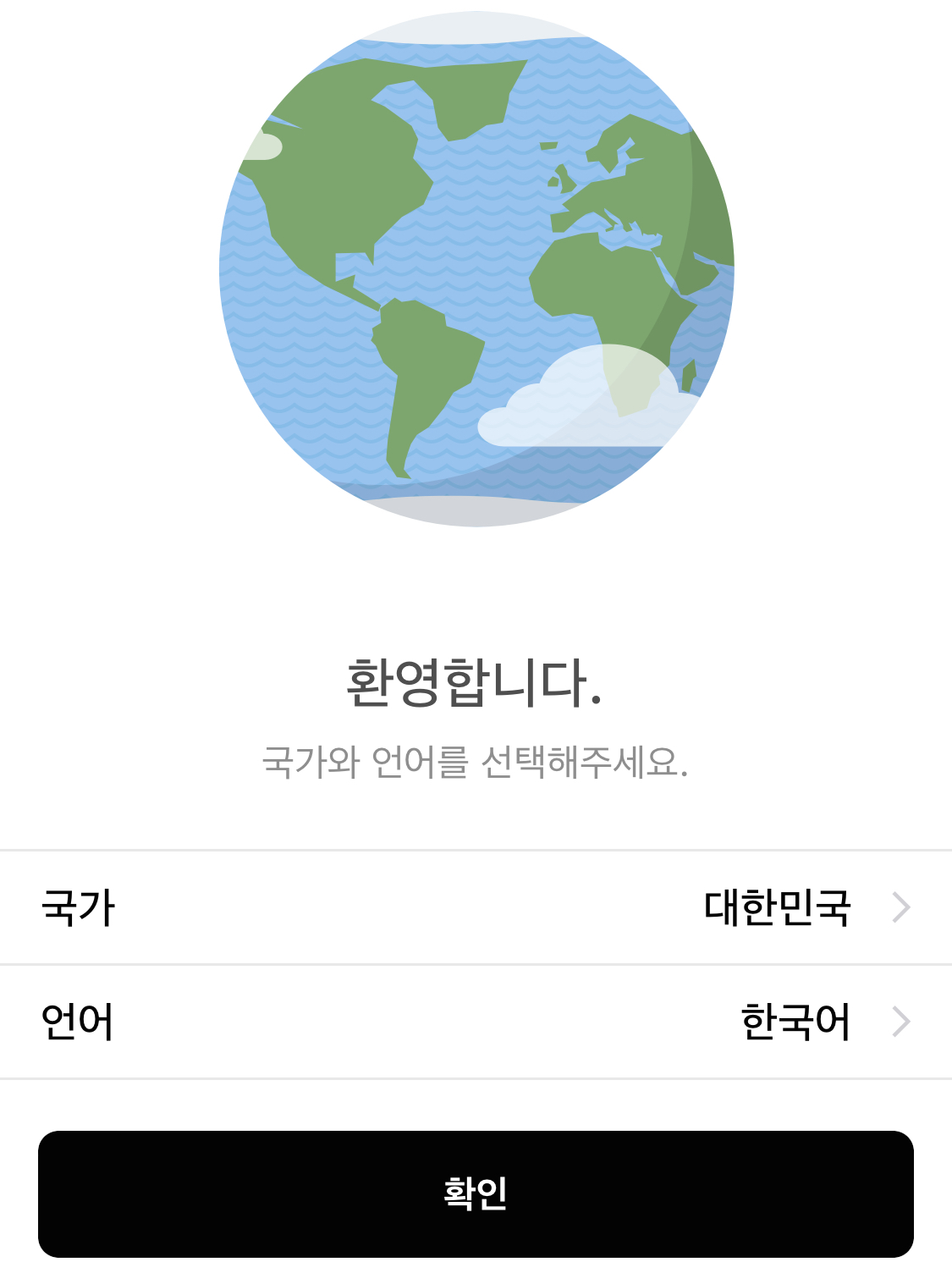 2. 국가 '대한민국', 언어 '한국어' 선택 후 확인 클릭
