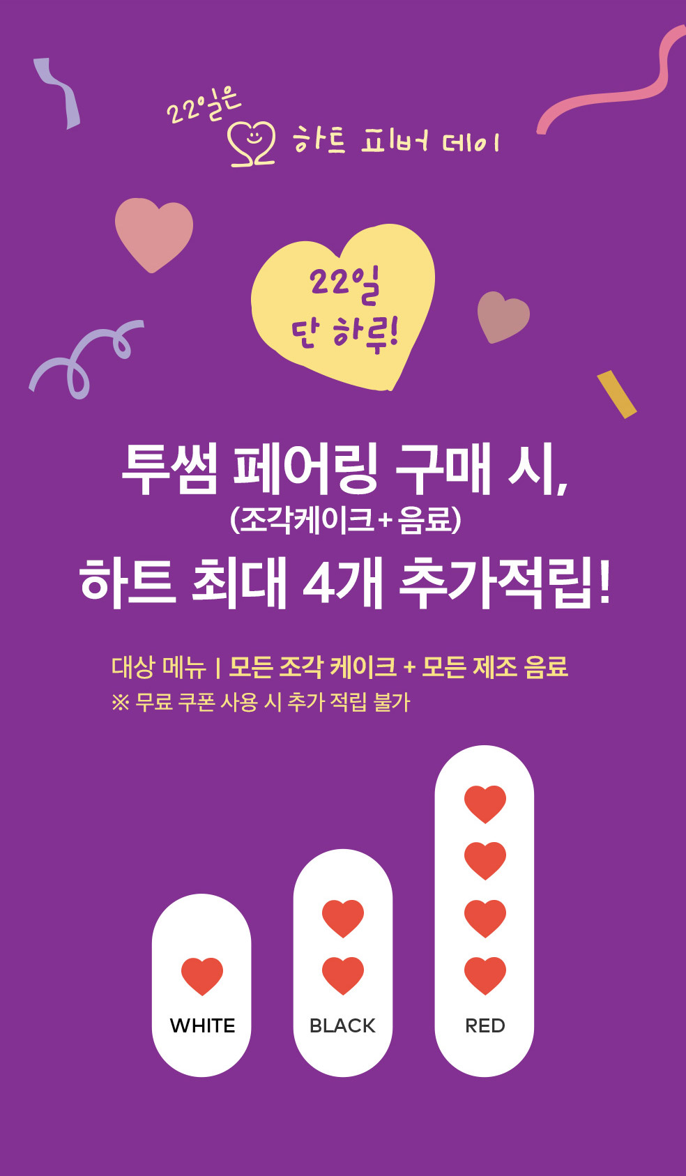 - 투썸 페어링(조각 케이크+음료) 구매 시 하트 최대 4개 추가 적립